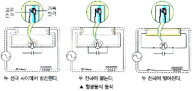 [스위치 닫기 - 점등관의 전극사이 방전]→[열 발생]→[바이메탈 가동 전극이 고정 전극에 붙음]→[점등관 내부에 방전 중지]→[형광 방전관의 필라멘트에 많은 전류가 흘러 필라멘트 가열]→[자외선 형광물질을 자극하여 빛을 냄]→[점등관 내부의 온도 하강]→[가동 전극이 고정 전극에서 떨어지는 순간, 안정기의 양단에 높은 전압이 순간적으로 발생]→[방전관의 양쪽 필라멘트에 가해짐]→[양쪽 필라멘트 사이에는 방전이 일어나서 자외선이 발생]→[형광 물질을 자극해 빛을 발산]