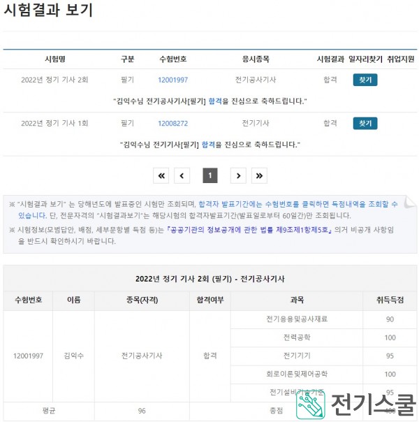 1회차 전기기사 필기 고득점으로 합격 후 공사기사도 빠른시일내로 취득하고싶어서 과목면제 받지 않고 바로 시험봤는데 매우 쉽게 느껴졌습니다 ㅎㅎ 특히 이번에 어려웠다던 회로이론이나 전기기기도 문제 푸는데 재밌게만 느껴졌습니다! 1회차 전기기사 실기는 공사기사 필기와 같이 준비하느라 시간이 많이 부족해서 실기이론교재 2회독에 과년도 7개년밖에 하지 못하였는데도 기술사님께서 실기강의 때 가르쳐주신 이론과 필기 때 열심히 해둔 이론덕에 74점으로 합격한거 같습니다! 필기강의 때 필기를 열심히 해둬야 한다는 말씀 듣고 빡세게 했던 것이 합격에 큰 영향을 준 것 같습니다. 공사기사 실기도 다이렉트로 합격하겠습니다! 감사합니다 ㅎㅎ