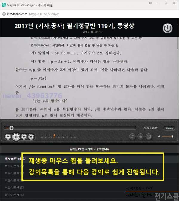 재생중 마우스 휠을 아래로 돌려보세요. 강좌 목록이 나타납니다. ^^ 강좌 목록을 클릭하면 강좌를 쉽게 이동할 수 있습니다. 화살표 아래버튼을 눌러도 되며, 페이지 다운버튼을 눌러도 됩니다.