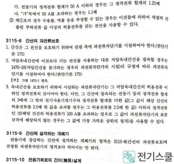 저압 옥내 배선의 각 부분마다 그 부분을 통하여 공급되는 전동기 등의 정격 전류의 합계의 1. 25배(그 전동기 등의 정격 전류의 합계가 50A를 넘을 경우에는 1. 1배)의 값 이상인 허용 전류의 것일 것.