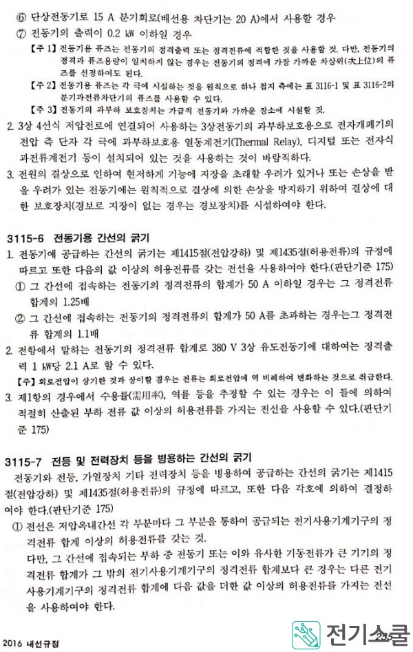 전선의 굵기는 기술기준 195조에 의한 산출허용전류 및 전압강하를 고려하여 그 값 이상의 허용전류를 가지는 전선을 사용하여야 한다. 단, 전동기만의 회로의 간선에 적용하는 전동기의 정격전류의 합계는 3상 380V 유도전동기에 대하여 정격출력 1KW당 2.1A로 할 수 있다. 회로전압이 사이할 경우에는 회로전압에 역비례하여 변화하는 것으로 취급한다.