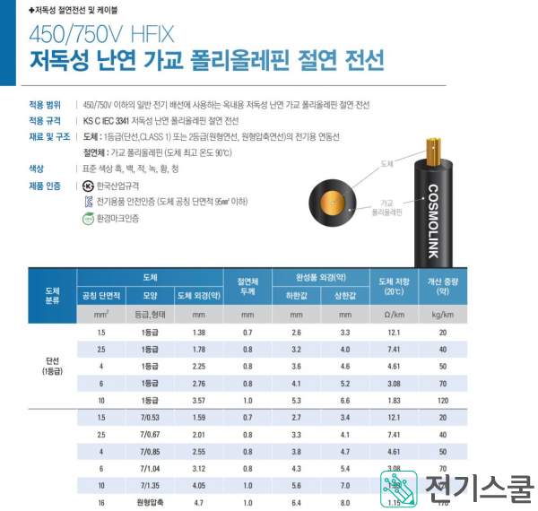 450/750V HFIX 저독성 난연 가교 폴리올레핀 절연 전선 / 전선의 굵기 / 전선규격