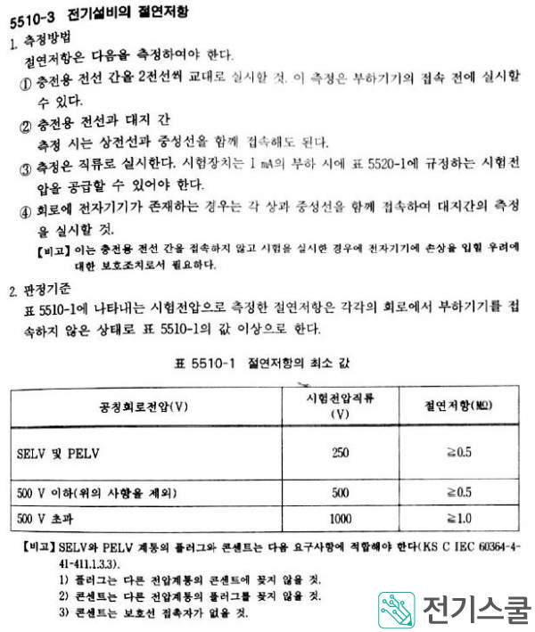 전기사용 장소의 사용전압이 저압인 전로의 전선 상호간 및 전로와 대지 사이의 절연저항은 개폐기 또는 과전류차단기로 구분할 수 있는 전로마다 다음 표에서 정한 값 이상이어야 한다. 다만, 전선 상호간의 절연저항은 기계기구를 쉽게 분리가 곤란한 분기회로의 경우 기기 접속 전에 측정할 수 있다. 또한, 측정 시 영향을 주거나 손상을 받을 수 있는 SPD 또는 기타 기기 등은 측정 전에 분리시켜야 하고, 부득이하게 분리가 어려운 경우에는 시험전압을 250V DC로 낮추어 측정할 수 있지만 절연저항 값은 1MΩ 이상이어야 한다.