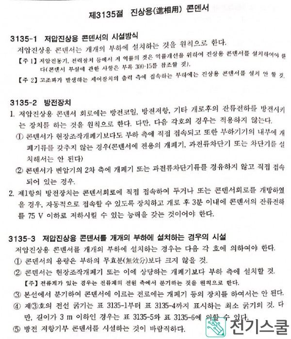 내선규정 진상용 콘덴서 / 저압 진상용 콘덴서 개별부하설치 / 저압방전장치 3분 75V