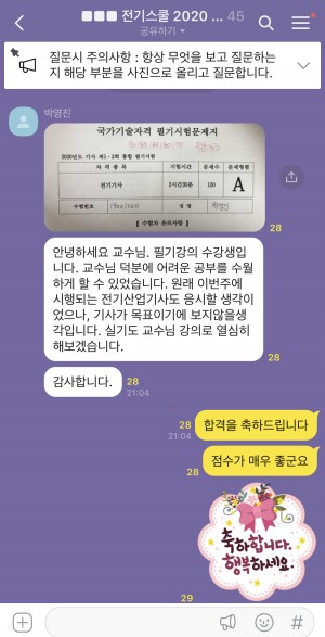 합격했습니다. 시험전에 질문한 몇가지가 그대로 출제되어 쉽게 합격했습니다. 남들은 감도전류 문제 전항정답을 기대할때 행복회로 돌리면서 합격을 기다렸습니다. 기술사님 강의와 답변에 감사드립니다. 전기스쿨 선택하길 잘햇다 생각됩니다. ㄷ ㅅ 들었을때는 뭔말인지도 몰랐는데 기술사님의 질문에 하나하나 답변하는 카카오톡이 도움이 많이 되었습니다. 마치 개인교습같았습니다. 이점 정말 감사드립니다.