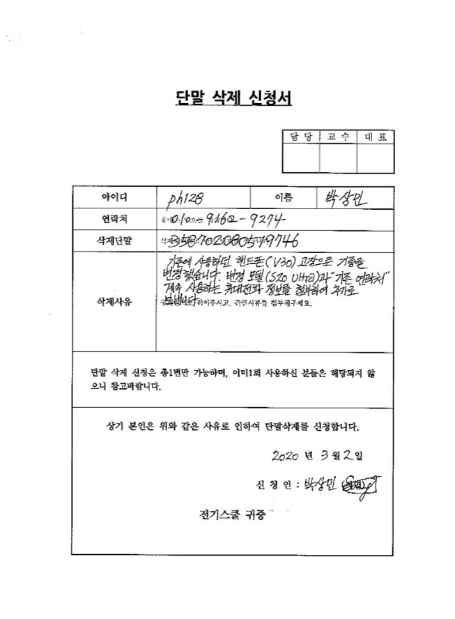 기기 변경등이 진행되면 단말 초기화 요청을 해주세요.