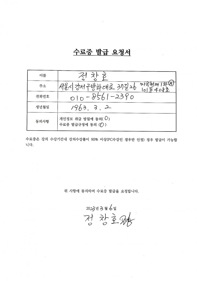 수료증 발급에 관한 공지 (수료증발급 요청서)