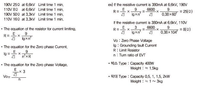 한류저항기는 선택및 방향지락계전기(SGR, DGR)를 동작시키는데 필요한 유효전류를 발생시키고 개방삼각결선회로의 각상 전압 중 제삼고조파전압의 발생을 방지하며, 중성점 불안정현상등의 이상 현상을 억제하는데 필요합니다.