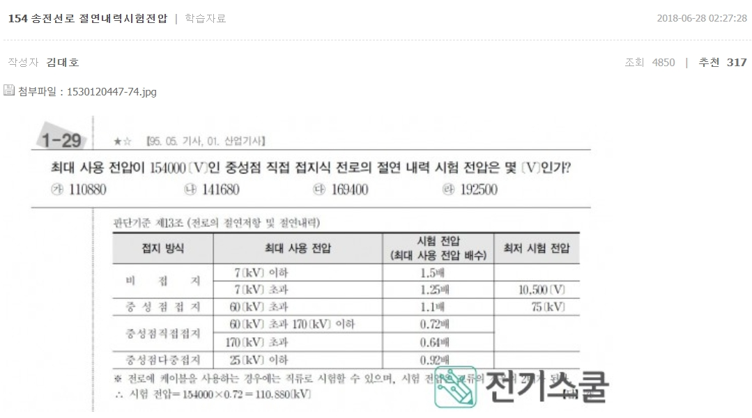 커뮤니티-학습자료-14번탭-731번의 154 송전선로 절연내력시시험전압 문제의 해설에 대해서