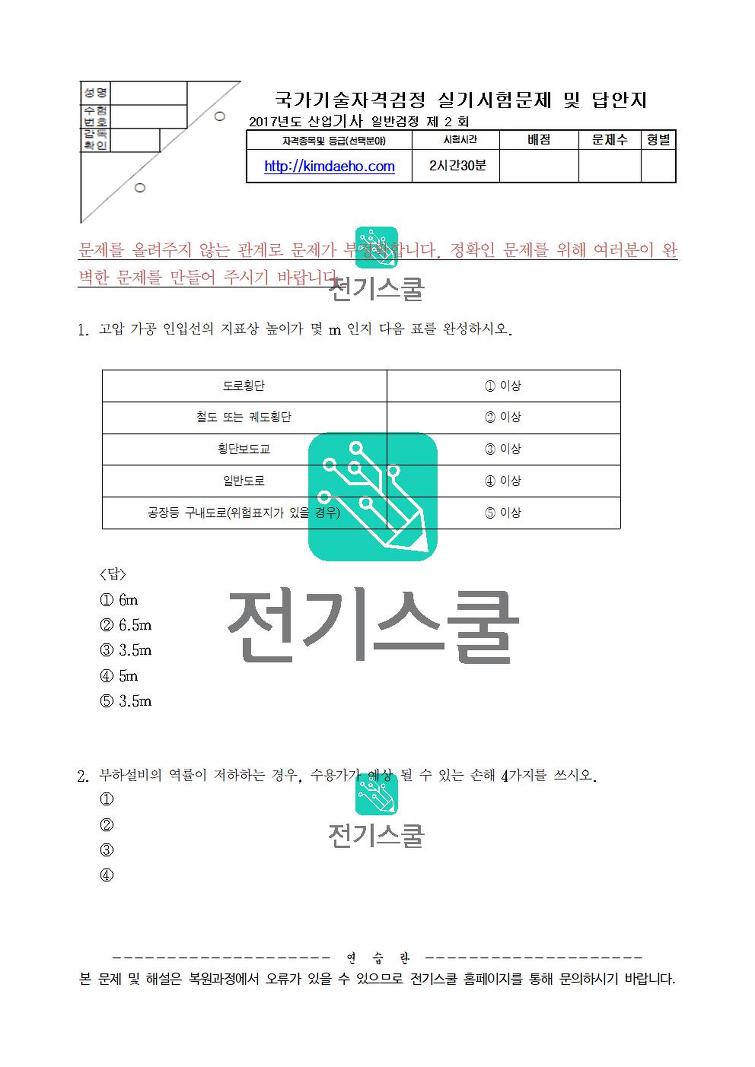 2017년 제2회 전기산업기사 실기 문제 복원 및 해설 (2차 99%)